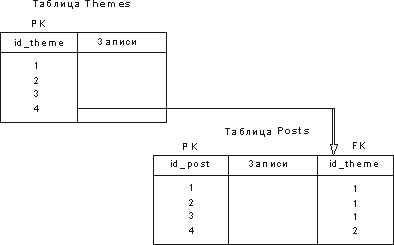 Первичным ключом таблицы themes является id_theme, а таблицы posts - id_post. Обратите внимание, что поле id_theme присутствует и в таблице posts. Каждое значение этого поля в таблице posts является внешним ключом (в данном случае это внешний ключ для первичного ключа таблицы themes). Внешний ключ сокращенно обозначают как FK (foreign key).Как видно из рис.1, внешний ключ ссылается на первичный ключ таблицы themes, устанавливая однозначную логическую связь между записями таблиц themes и posts. Иначе говоря, если внешний ключ для записи (сообщения) с PK=1 в таблице posts имеет значение внешнего ключа равное 1, то это значит, что это сообщение относится к теме с PK=1 таблицы themes.