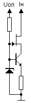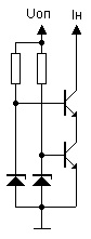 Ток нагрузки равен: Iн=(Uст-Uбэ)/R2 . Выходное сопротивление такого источника равно выходному сопротивлению каскада с общим эмиттером. Недостаток - относительно низкое выходное сопротивление и наличие эффекта модуляции h21э под действием Uк из-за изменения нагрузки.