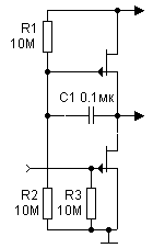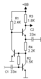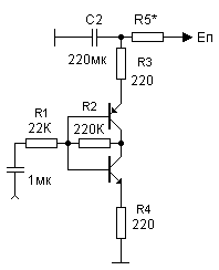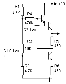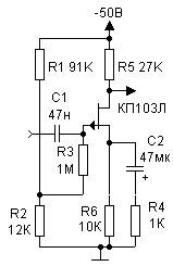имеет коэффициент усиления около 100...150. Благодаря съёму сигнала с эмиттера транзистора VT2 каскад имеет низкое входное сопротивление. Номинальное входное напряжение - 20мВ.