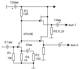 12.Усилитель с разветвлением сигналов на несколько каналов с помощью истоковых повторителей.