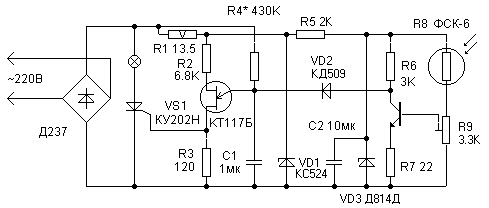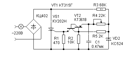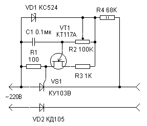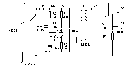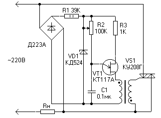 работает следующим образом. Положительная полуволна питающего напряжения проходит в нагрузку практически без ослабления через диод VD2. Релаксационный генератор питается пульсирующим напряжением (в течениие отрицательной полуволны), ограниченным стабилитроном VD1 на уровне 24В. С появлением каждой отрицательной полуволны конденсатор С1 начинает заряжаться через цепь R2, R4. Скорость зарядки можно регулировать переменным резистором R2. Как только напряжение на конденсаторе достигнет порога открывания транзистора VT1, на управляющий электрод тиристора VS1 поступает положительный импульс и тиристор открывается до конца полупериода. Таким образом, изменением постоянной времени фазосдвигающей цепи R2C1 осуществляктся регулировние мощности, отдаваемой в нагрузку.