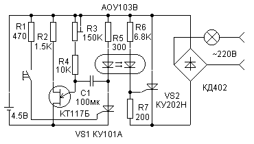 Такой автомат может использоваться, например в общих коридорах с целью экономии электроэнергии. Необходимое время включённого состояния устанавливается подстроечным резистором R3. После заряда конденсатора до напряжения включения ОПТ, т.е. после его включения, конденсатор С1 на короткое время создаёт на аноде тиристора VS1 отрицательное напряжение и тем самым выключает его.