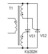 Импульсный трансформатор тот же, что и в предыдущей схеме. Замена симистора двумя тиристорами показана на рисунке: